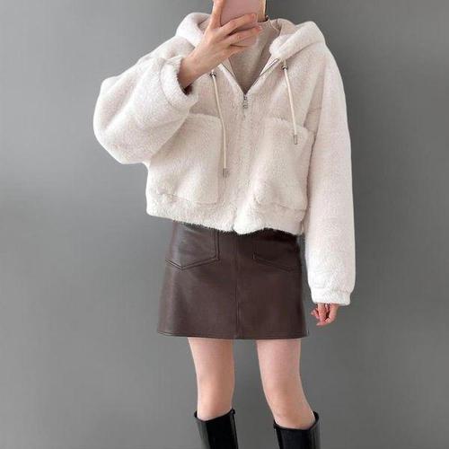[옷자락]여성 인조밍크 스트링 후드 가죽 포켓 겨울 코트