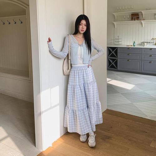 [다잇템]여자 나들이 내추럴 티어드 후레아 격자 스커트