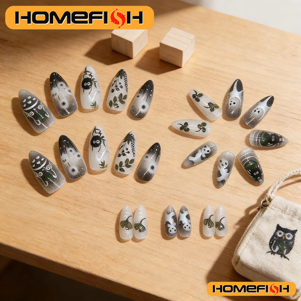 24개 그라데이션 블랙 인조 손톱 귀여운 만화 고양이 눈 숲 요정 소녀 프레스온 네일 광택 아몬드 스윗 쿨 가짜 네일 팁