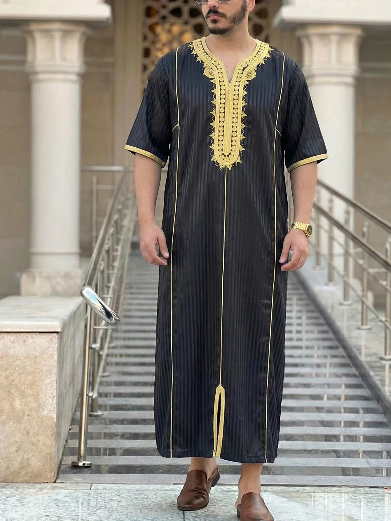 남성 전통 스트라이프 자수 반팔 로브 루즈핏 기도복 아프리카 중동 스타일 캐주얼 에스닉 패션