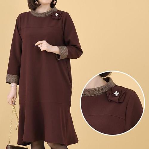 [애비뉴투지]엄마옷 체크 배색 스텐카라 브로치 여성 가을 초겨울 긴팔 루즈핏 플레어 정장 원피스 K1120..