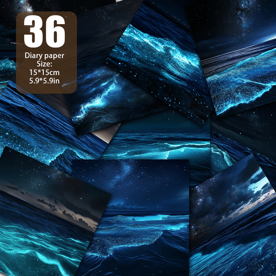 TEMU 꿈꾸는 빛나는 바다 - 별이 빛나는 하늘 아래 반짝이는 파도, 빛나는 플랑크톤은 물의 전체 영역을 밝혀 환상적이고 신비한 형광 효과를 만들어내며, 배경 없이 순수합니다. 스크랩북 종이, 수제 종이, 재료 종이가 쓰기 적합하며, 잡지 일기장 수제 인사말 카드 제작 배경 장식 DIY 앨범에 사용됩니다. 사양: 5.9*5.9인치 36매