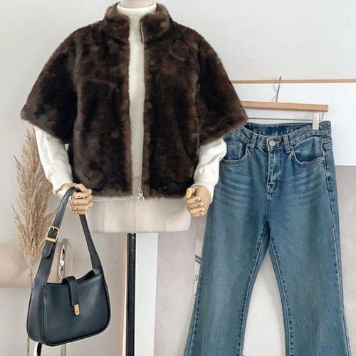 옷자락 / 여자 포근 루즈핏 더블포켓 하이넥 퍼 반팔 집업