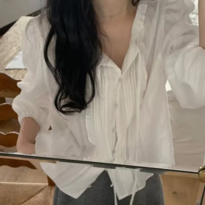 TEMU 여성 여름 레이스 라운드 블라우스 셔링 퍼프소매 솔리드 부드러움 상큼 원단 소프트 편안 통기 상의