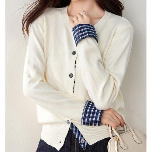[패션시그널]롤업 배색소매 라운드넥 가디건 5AD7D6