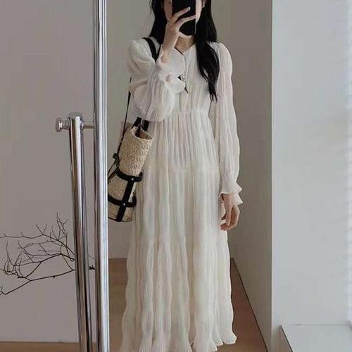 2025 신상프렌치 스타일 롱 원피스 주름 디자인 허리끈 슬림 핏 N-0032