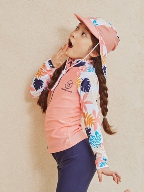 [리틀맘]초등학생 주니어 여아 수영복 집업 긴팔 래쉬가드 세트 3PCS 워터레깅스 생존수영
