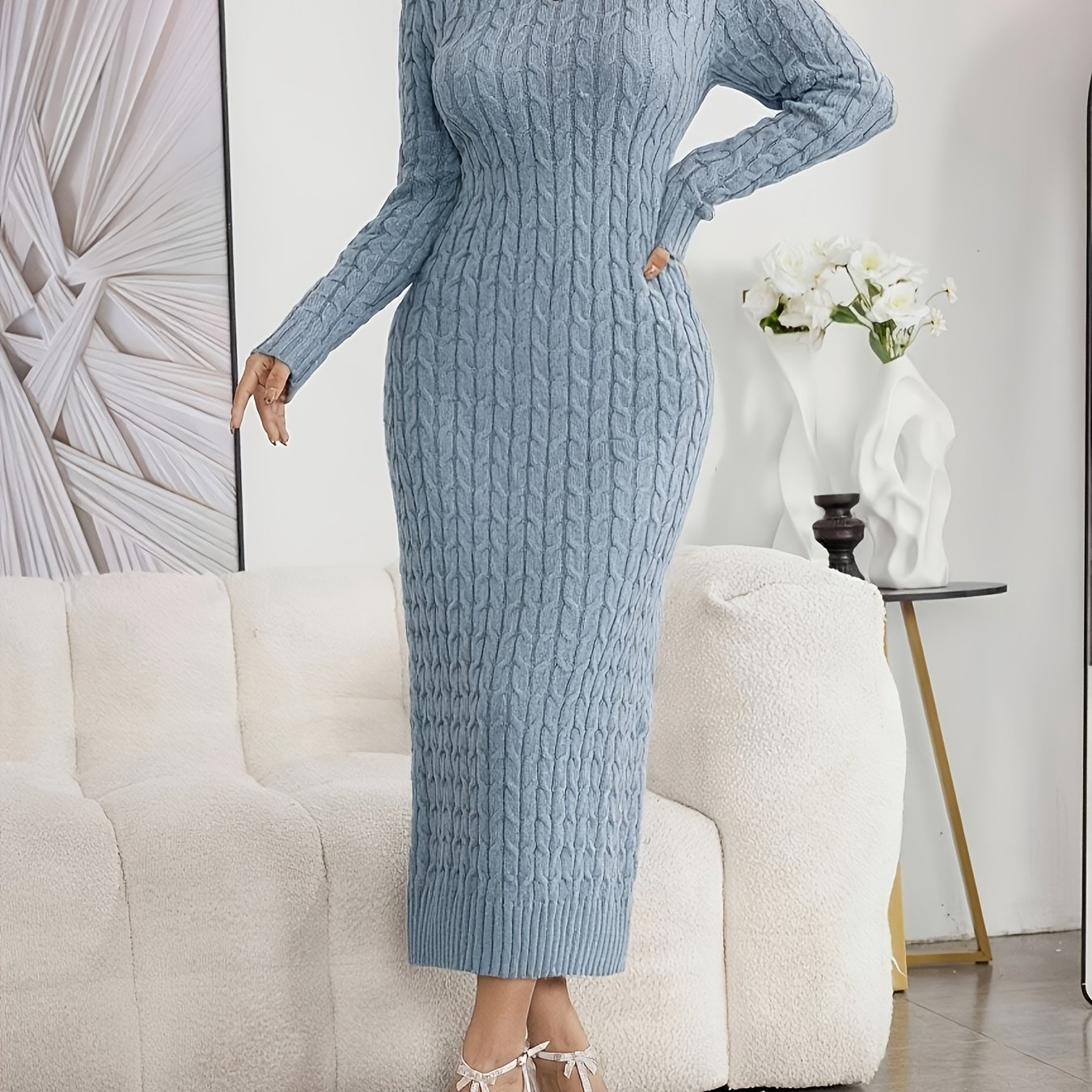 TEMU QD0730025 여성용 가을/겨울 하이넥 스웨터 드레스 스커트