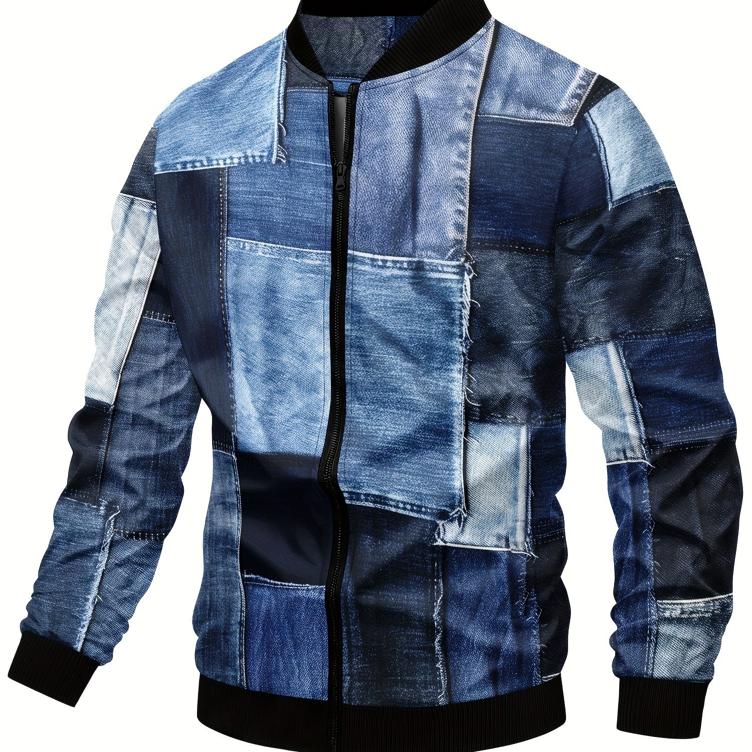 TEMU 남성 캐주얼 패치워크 데님 프린트 트랙 재킷 - 약간의 스트레치가 있는 크루 넥 폴리에스테르 니트 원단, 올 오버 3D 프린트 디자인이 있는 일반 핏 액티브 재킷