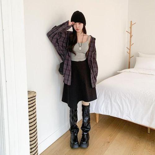 [옷자락] 여자 내추럴핏 오버사이즈 지지미 체크 후드 면 롱 셔츠 남방
