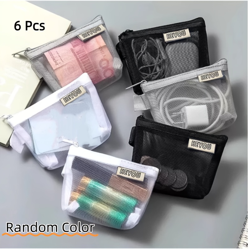 TEMU 6개 미니 메쉬 수납 가방 세트 - 다양한 색상(블루, 그린, 레드, 퍼플, 베이지, 브라운) 나일론 & 투명 지퍼 파우치 여행용, 메이크업, 문구 정리함, 여행 액세서리