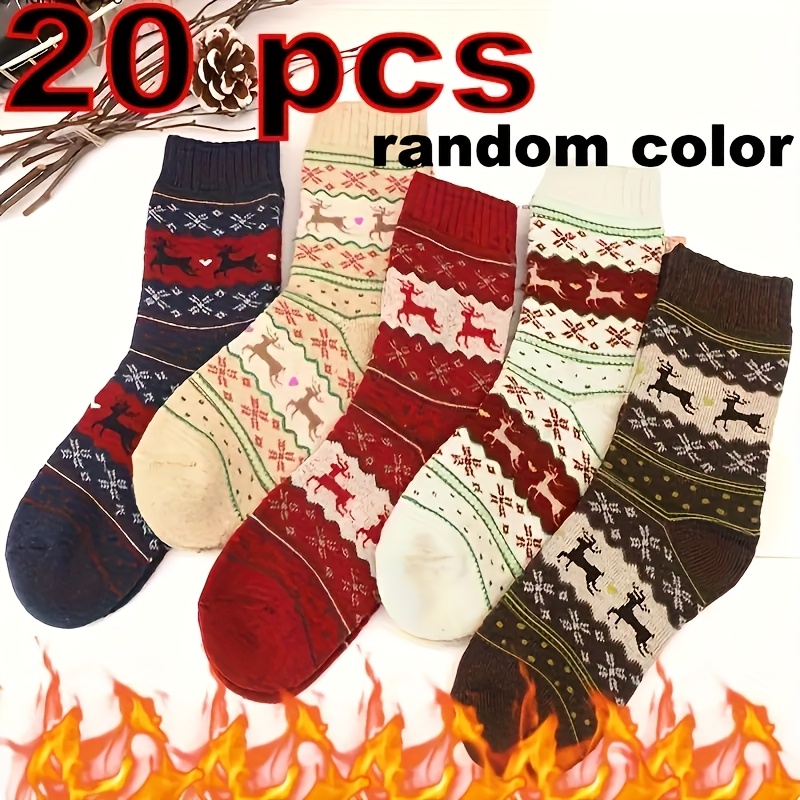 TEMU 20개 여성용 두꺼운 겨울 따뜻한 양말, 사슴 & 눈꽃 프린트 - 포근한 기모 안감 보온 슬리퍼, 부드럽고 따뜻한 겨울 양말 (가정용, 크리스마스, 휴일 쇼핑객, 휴일 선물용), 튼튼한 소재, 축제 분위기 디자인, 시즌별 신발