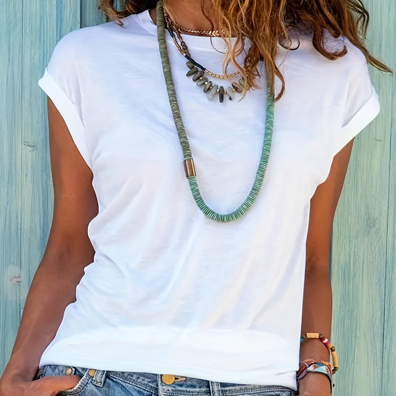 TEMU 여성 여름 간편 반짝이 라운드넥 반팔 티셔츠 | 단색, 봄/여름 시즌에 적합