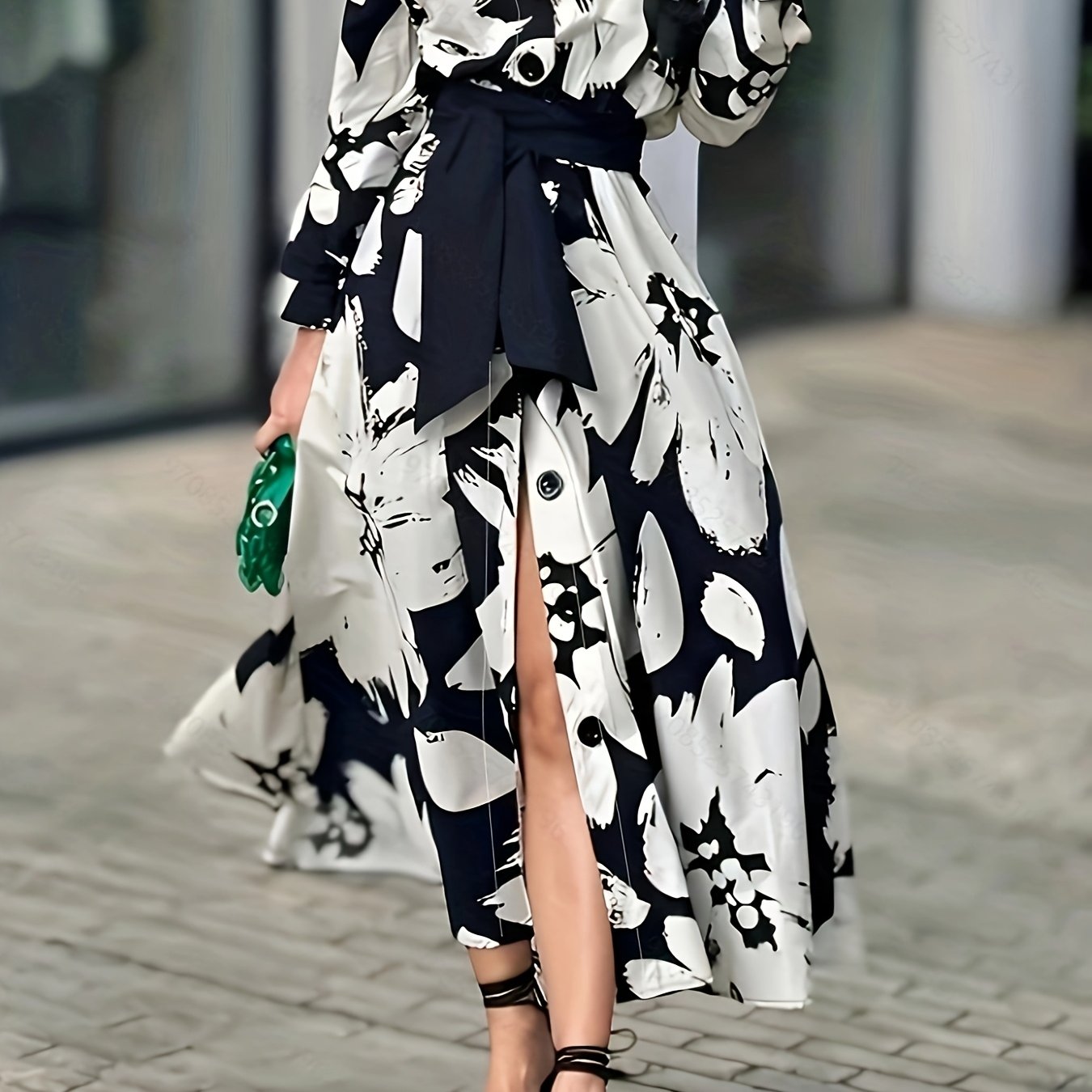 TEMU A라인 긴팔 버튼업 대비 플로럴 프린트 타이웨이스트 라펠 미디 드레스