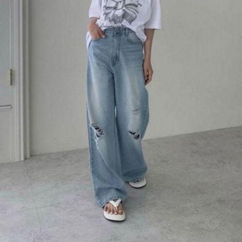 [옷자락] 여성 스트리트 빈티지 찢어진 와이드핏 청바지