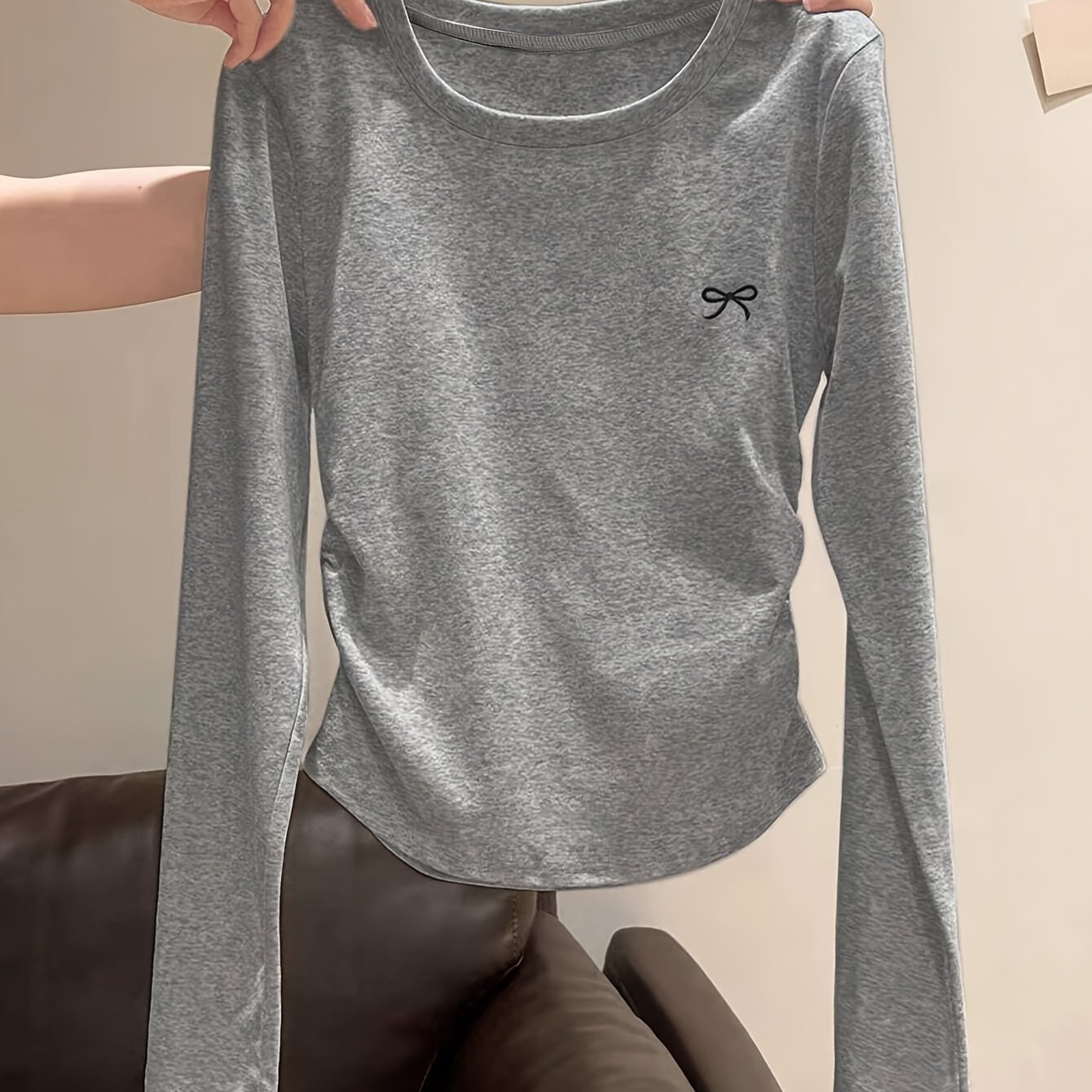 TEMU 여성용 우아한 V넥 긴팔 티셔츠, 리본 프린트 - 슬림핏, 허리 주름 디자인, 라이트 그레이, 봄/가을 캐주얼 스타일, 여성 티셔츠, 여성용 긴팔 폴로, 여성용 폴로, 여성 티셔츠, 여성 상의, 여성 반팔, 반팔티, 반팔티 여성