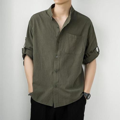 데일리 캐주얼 남성 여름 차이나 카라 린넨 7부 셔츠
