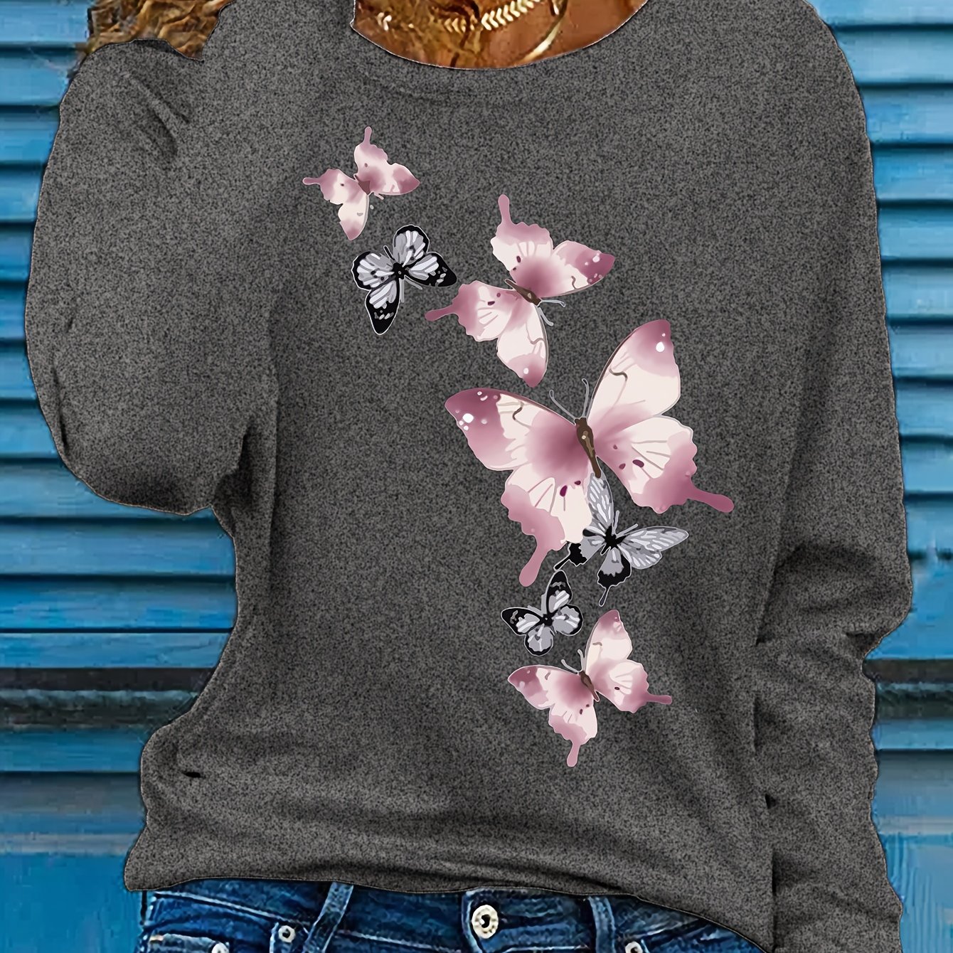 TEMU 나비 프린트 티셔츠, 긴팔 크루넥 캐주얼 상의, 봄 & 가을 여성 의류