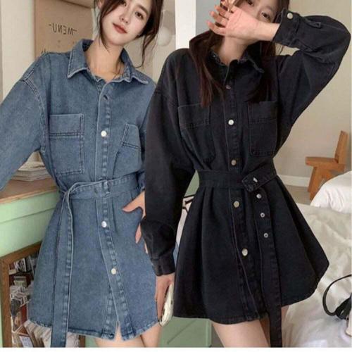 데님 미니 셔츠 허리 원피스 겸용 청 여성 벨트