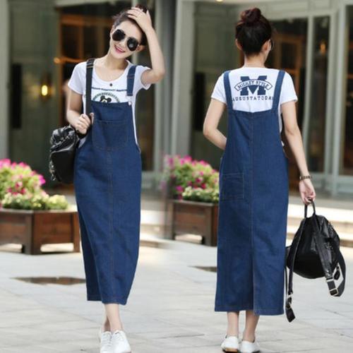 [다잇템]여자 진청 일자 스커트 서스펜더 진 롱 원피스 (10583709A)