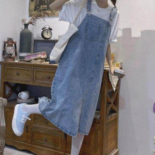 [다잇템]여자 진청 일자 스커트 서스펜더 진 롱 원피스 (10583709A)
