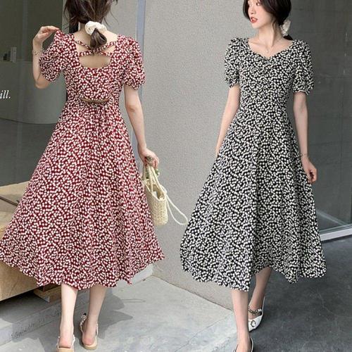 [오너클랜]인기상품 체리 무늬 브이넥 니트 여름용 반팔 프릴 미디 롱원피스 [WFLL7N0_260304]