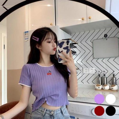 [오너클랜]인기상품 체리 자수 포인트 세미 크롭 반팔 티셔츠 배색 코디 [WFLS7X3_260205]