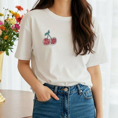 [셀럽하우스]여성 IZLH5210 체리 자수 포인트 반크롭 스타일 반팔 티셔츠