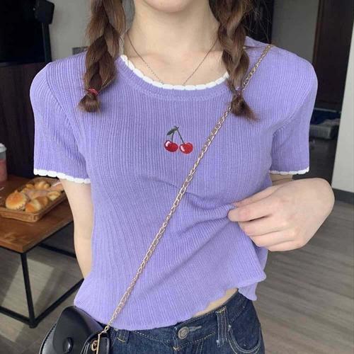 [셀럽하우스]여성 CMZV9734 여름 체리 자수 귀여운 티셔츠 세미크롭 반팔