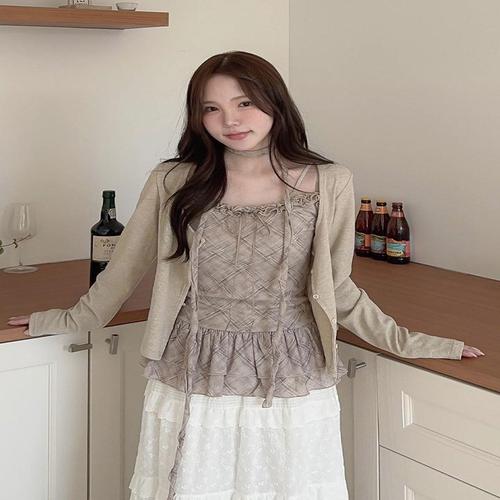[엘루이즈][엘루이즈] [3set/코디완성] 소피아 체크 스카프 프릴 나시 가디건 세트(3color)