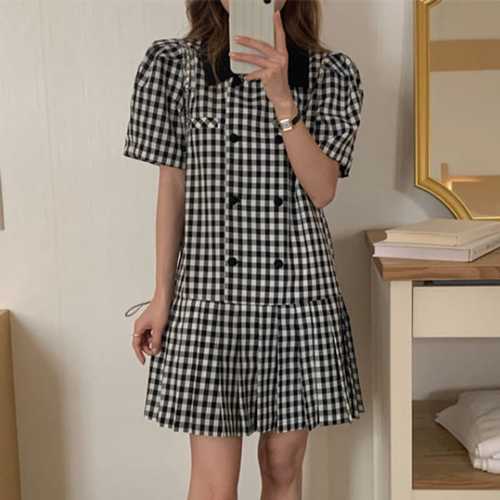 슈팅스타 / 카라넥 체크 더블 버튼 주름 스티치 원피스 963355