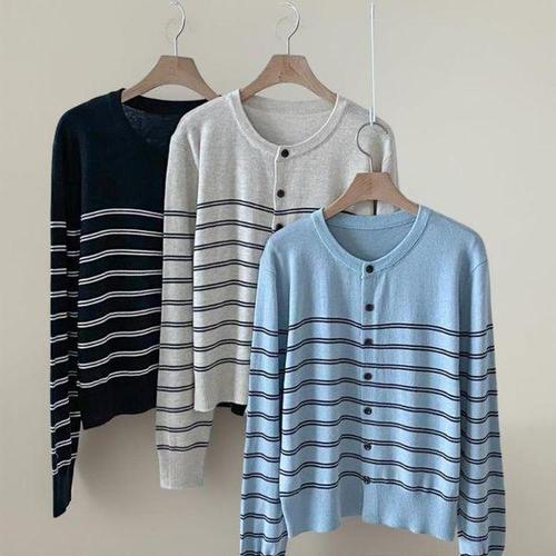 [신상오픈런]여성 클래식 더블 스트라이프 울 라운드넥 긴팔 니트 가디건