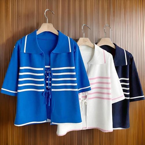 [신상오픈런]여성 스트라이프 카라넥 더블 스트랩 반소매 가디건