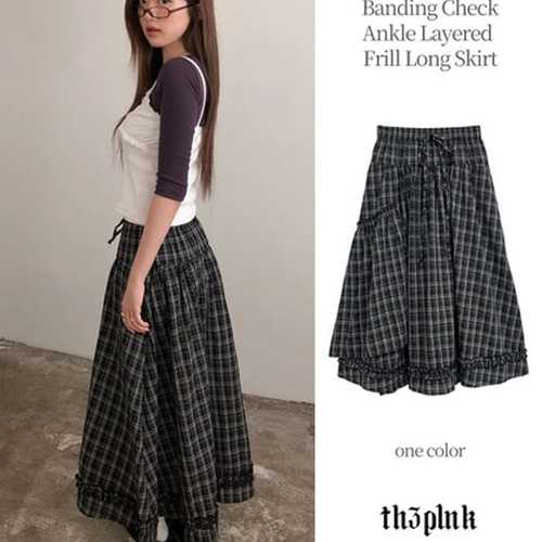 더핑크 / 무즈 밴딩 체크 언발 레이어드 프릴 롱 스커트