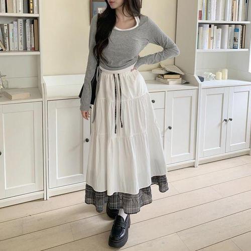[옷자락]여자 데일리룩 편안한 레이어드 체크 롱스커트