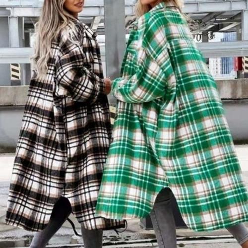 [옷자락]여성 키치 스타일 체크 포켓 카라넥 오버사이즈 롱 셔츠