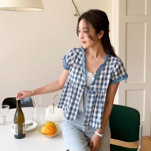 [신상오픈런]여성 체크 시스루 반팔 린넨 여름 블라우스