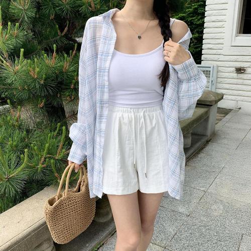 [옷자락]여자 캐주얼 린넨 체크 루즈핏 시스루 셔츠 남방