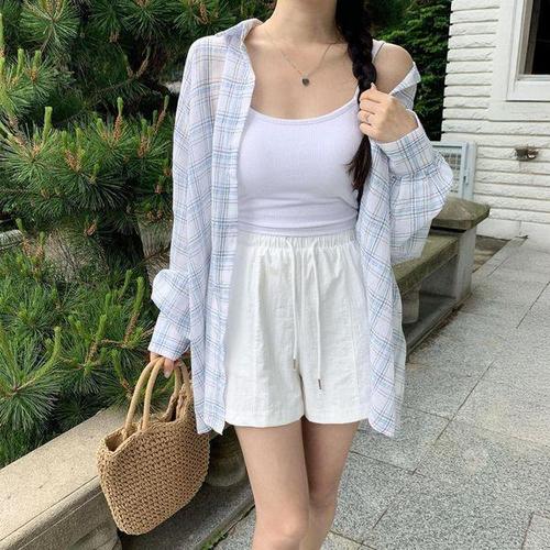 [1+1] 여성 여름셔츠 체크남방 오버핏 얇은긴팔 살안타템 시스루 린넨 롱 긴팔 블라우스 체크셔츠