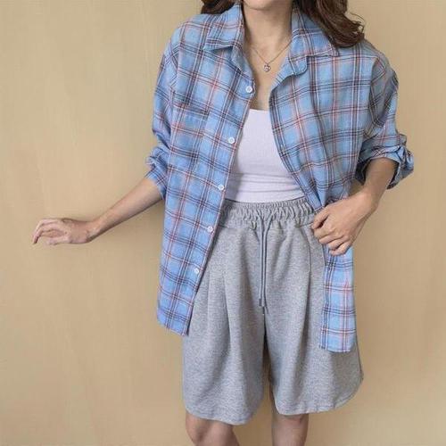 [신상오픈런]여성 체크 패턴 린넨 혼합 루즈핏 셔츠 블라우스