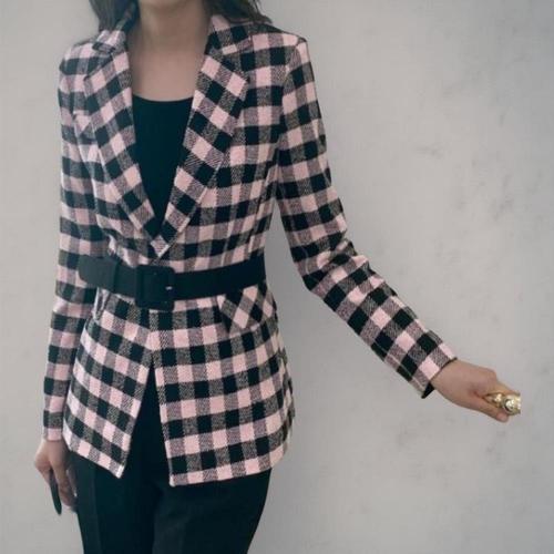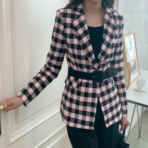 [신상오픈런]여성 키치 스타일 배색 체크 비스코스 벨트 자켓