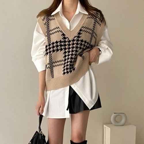 [셀러허브_여성트랜드패션]봄 가을 체크 V넥 루즈핏 니트 니트베스트