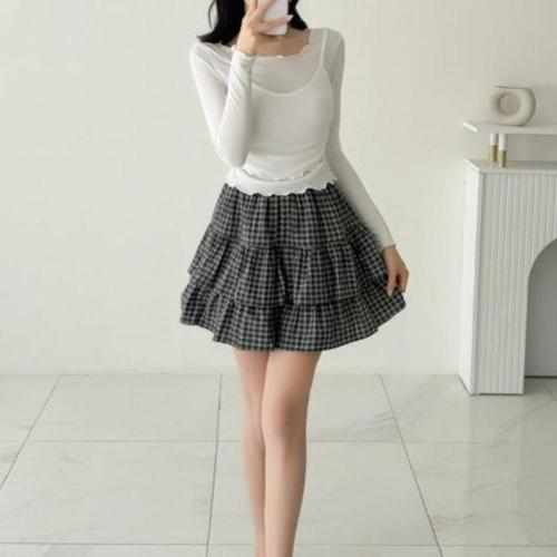 [신상오픈런]여성용 사랑스러운 배색 체크 프릴 미니 스커트