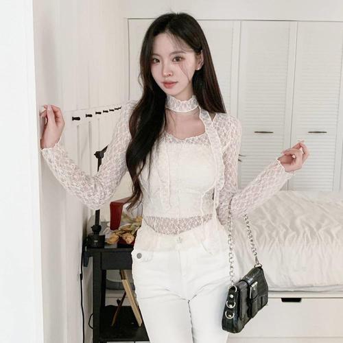 [옷자락]여자 초커넥 레이스 슬림핏 긴팔 시스루 블라우스