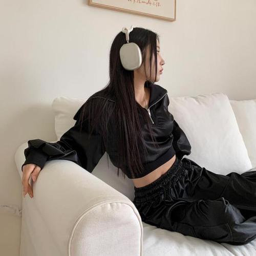 [다잇템]여자 폴라넥 반집업 광택 카고 밴딩 팬츠 세트