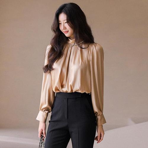 [스타일온미][스타일온미] 볼리브 진주 체인 SET 반하이넥 셔링 새틴 블라우스