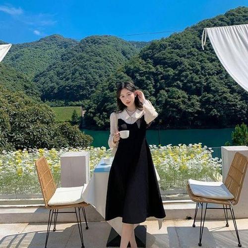 Makone 여성 봄 가을 레이스 기모 롱 원피스