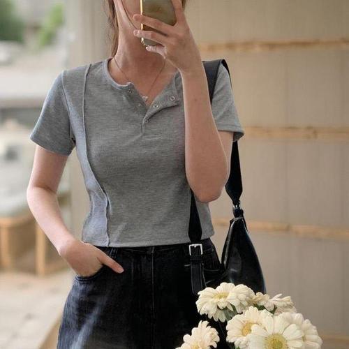샵앤) 여성 카라넥 골지 투버튼 베이직 반팔 니트티 DGB-WKN-4554-아이보리