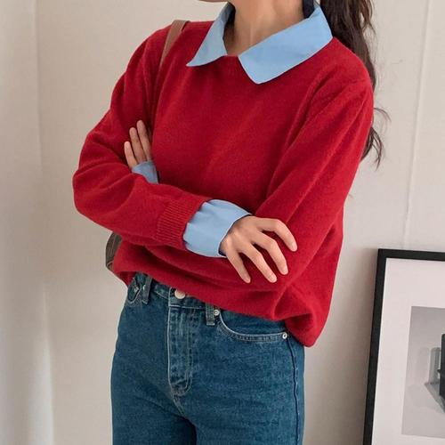 [샵앤][샵앤] 여성 데님레이어드 카라소매 니트 티셔츠 21DS-WKN-3792-레드