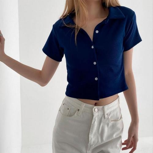 [다잇템]여자 편한 버튼 카라넥 슬림핏 반소매 크롭티